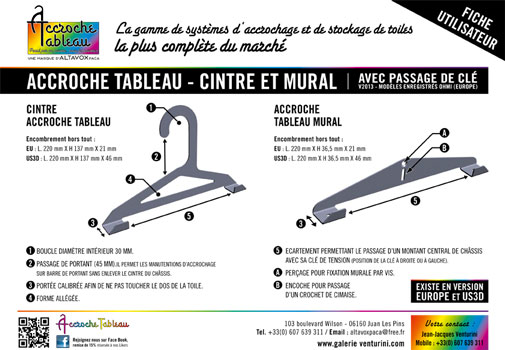 Grace à l’Accroche Tableau d’exposition (dit Mural) vous n’utiliserez plus de ficelle au dos de vos toiles pour les accrocher au mur ou à un crochet de cimaise.