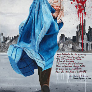D’une taille de 81 × 100 cm, cette composition en huile sur toile est rehaussée d’une finition résine, offrant ainsi une brillance et une profondeur supplémentaires à l’ensemble. Le spectateur est immédiatement plongé dans un décor chaotique et dévasté par la guerre, représenté par des bâtiments en ruines et un fond gris et triste. Ce paysage en détresse reflète la souffrance et la destruction inhérentes aux conflits.