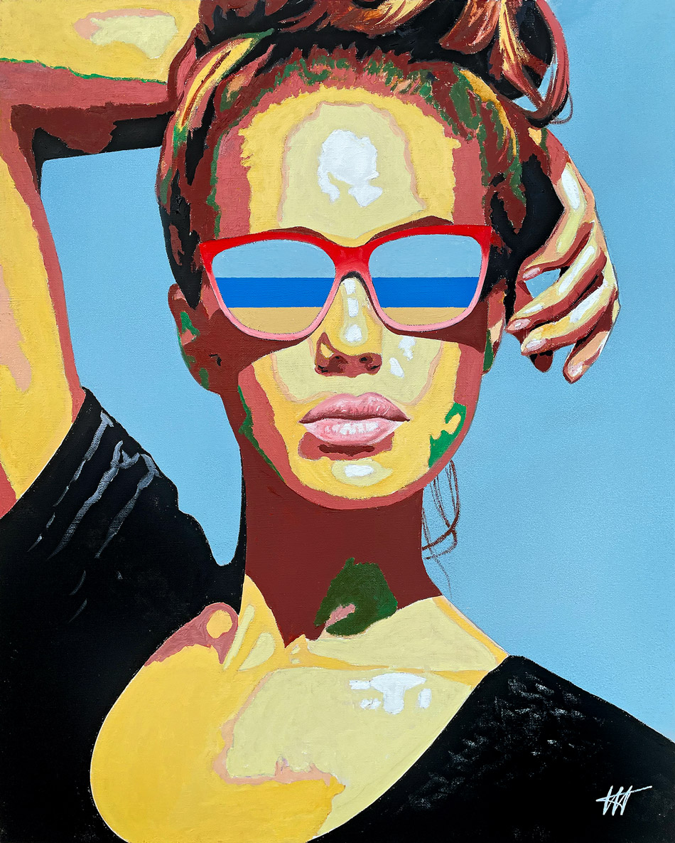 L’audace du mouvement Pop-Art se manifeste pleinement dans la palette de couleurs vibrantes et expressives qui habillent la toile. Les bleus profonds évoquent la mer infinie, les tons dorés rappellent le sable caressé par le soleil, et le ciel azuréen, teinté de nuances audacieuses, crée un fond dynamique qui confère au tableau une vitalité éclatante.