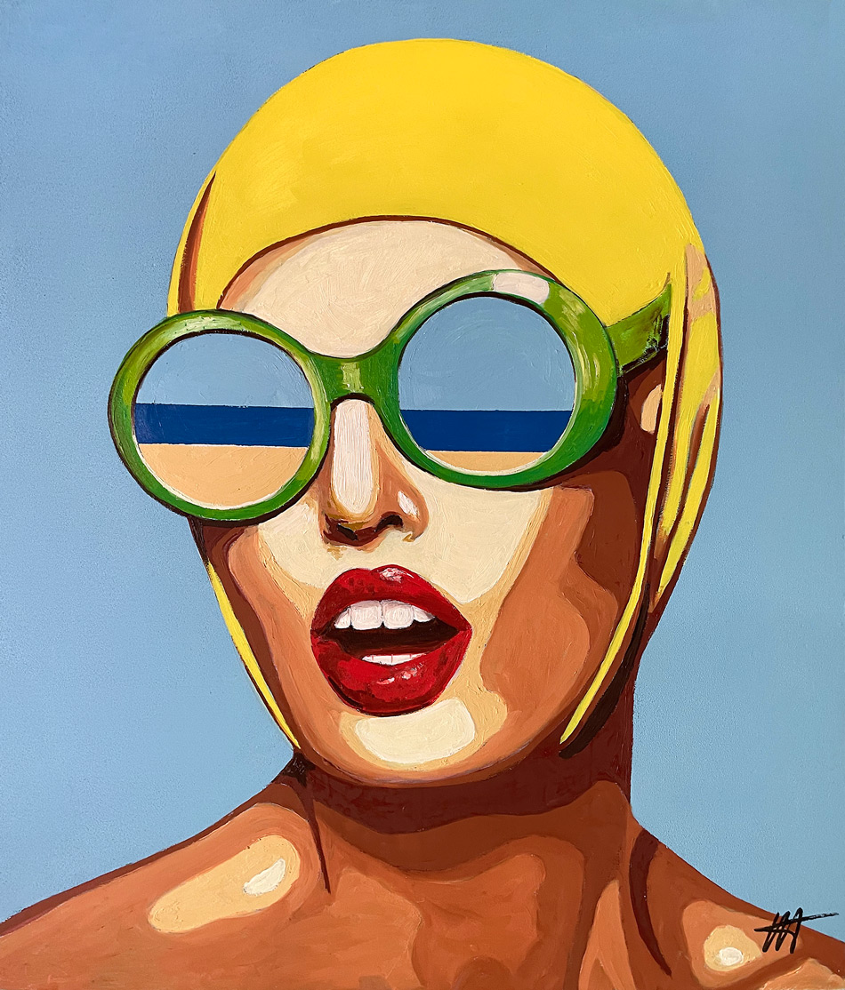 La femme à lunettes, face à la mer, incarne la beauté sereine de la nature et la puissance intérieure humaine. Son regard fixe l’horizon, absorbant l’immensité de l’océan et les vagues qui se brisent sur les rochers. Ses lunettes ajoutent de l’élégance à son visage gracieux, révélant une réflexion profonde et une contemplation silencieuse de la vie.
