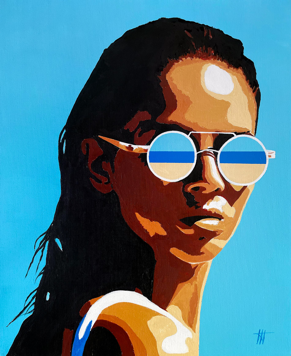 La femme à lunettes, face à la mer, est une vision captivante qui évoque à la fois la beauté tranquille de la nature et la puissance intérieure de l’être humain.