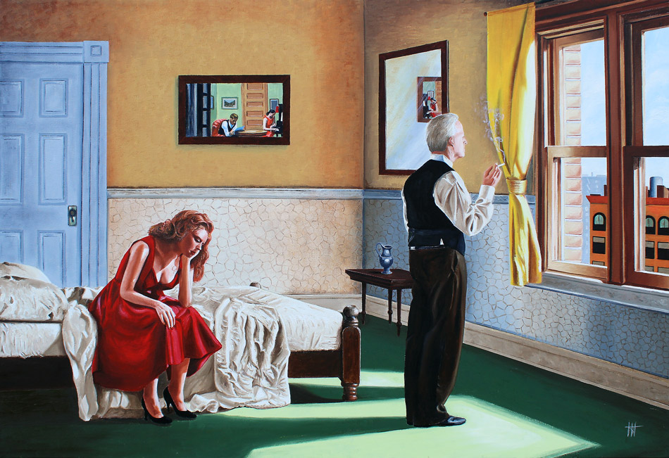 On retrouve dans cette œuvre un clin d’œil à l’artiste Hooper avec un de ces tableau « Room in New York » réalisé en 1932.
