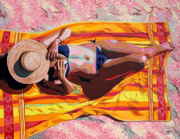 Elle bronze avec un petit canotier doré sur le visage, mais au fond d’elle elle a le nombril du monde à exhiber.
