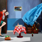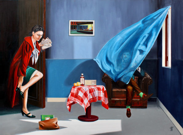 Ce tableau évoque les influences d’Edward Hopper, avec cette atmosphère particulière et son réalisme à contre-courant. En arrière-plan, on peut d’ailleurs distinguer une œuvre de Hopper datant de 1942, intitulée « Nighthawks. »