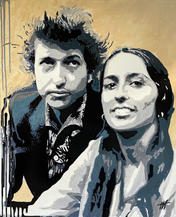 Ce tableau réalisé en peinture Acrylique sur toile représente 2 légendes de la scène musicale américaine : Bob Dylan et Joan Baez.