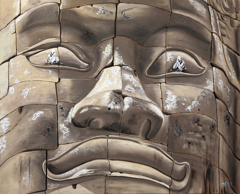 Dans ce tableau, l’artiste met en avant le visage de la statue d’Angkor Bath, symbolisant la lutte pour la liberté du Tibet. Le visage de la statue exprime à la fois sérénité et résilience face à l’oppression.