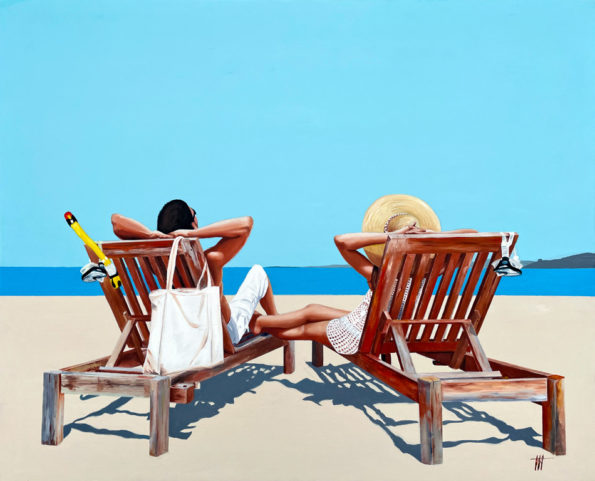 Cette peinture sur toile de lin réalisée à l’huile est le témoignage d’une belle scène de vie. Elle représente un couple proche, détendu, allongé sur des chaises longues en bois et profitant de la mer à la page du Crouton. Elle porte un joli chapeau de paille et une robe légère blanche, lui porte un pantacourt blanc. Ils sont adeptes du snorkeling et sont venus avec des masques et un tuba.