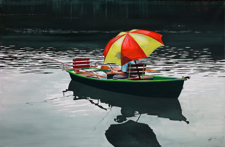 Dans le jour naissant, le pêcheur s’isole ainsi de la ville toute proche et de ses contraintes bruyantes. Seule une petite barque, délaissée non loin, le rattache encore à ses racines citadines.