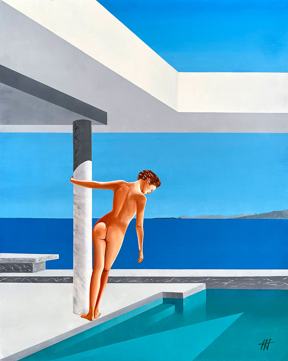 La mer intense amplifie son geste et dialogue avec l’horizon lumineux, qui s’étend jusqu’aux côtes, mêlant intimité et immensité.