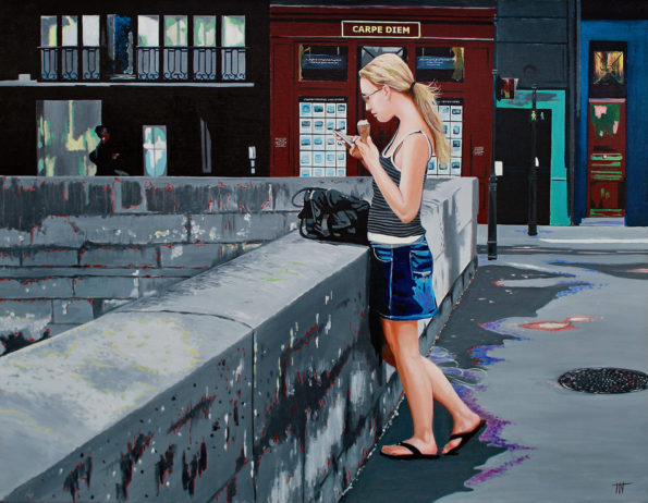 Lorsqu’on contemple cette huile sur toile, notre regard est immédiatement attiré par une jeune femme qui se trouve sur un pont. D’une part, elle tient une glace dans sa main, symbole de plaisir et de savourer l’instant présent. D’autre part, son autre main tient un téléphone, représentant notre connexion constante au monde moderne.