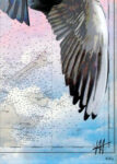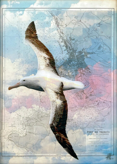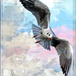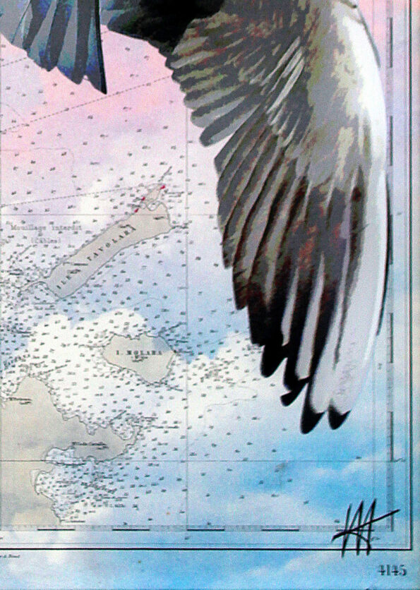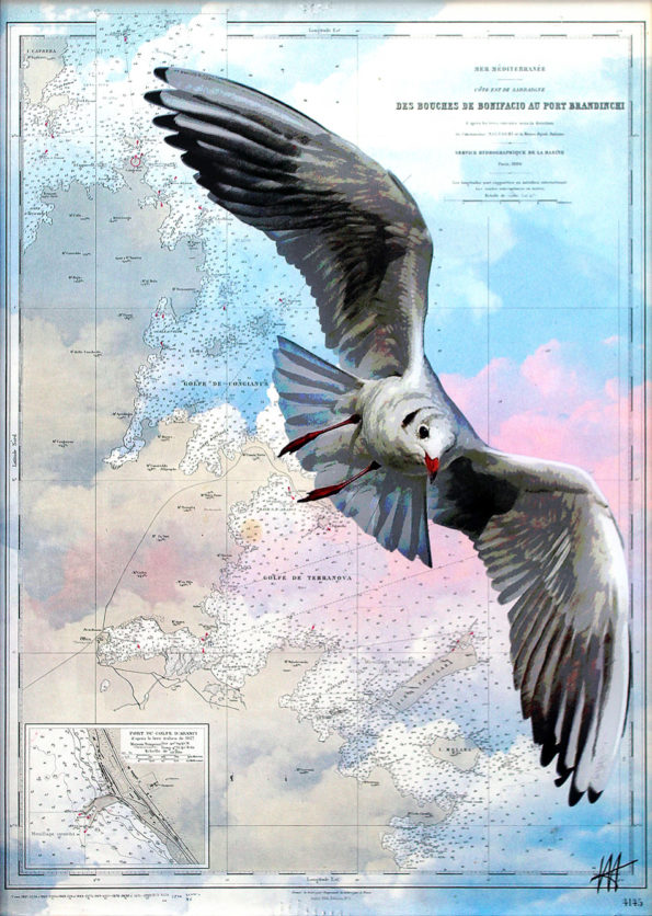 L’œuvre d’art « Voyage/3 » est une représentation fascinante de l’union étonnante entre un goéland et une carte marine.