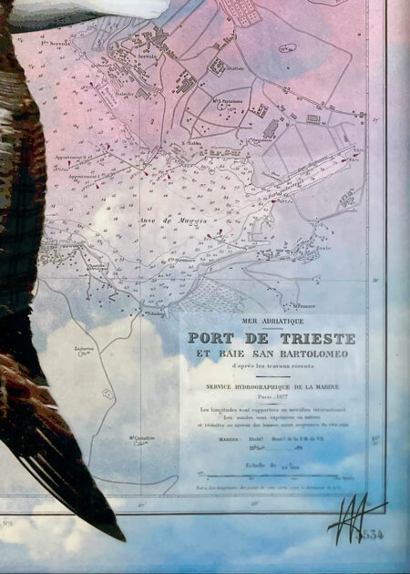 Cette création artistique unique, est le fruit de la créativité de l’artiste Jean-Jacques Venturini d’Antibes. Elle s’impose comme une œuvre singulière qui marie une carte marine authentique à une giclée sur plexiglass. Ce tableau, dévoile une représentation captivante de l’inhabituelle symbiose entre un goéland et une carte marine.