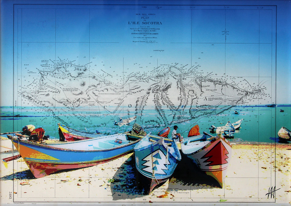 Plexiglas peint, sur carte marine, encadré.