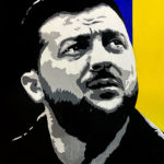 Cette toile intrigante présente une image puissante de Zelinsky, le regard tourné vers l’horizon, tandis que le drapeau ukrainien flotte majestueusement en arrière-plan. Les couleurs vives et les contrastes marquants caractéristiques du pop art confèrent une énergie électrisante à cette création.