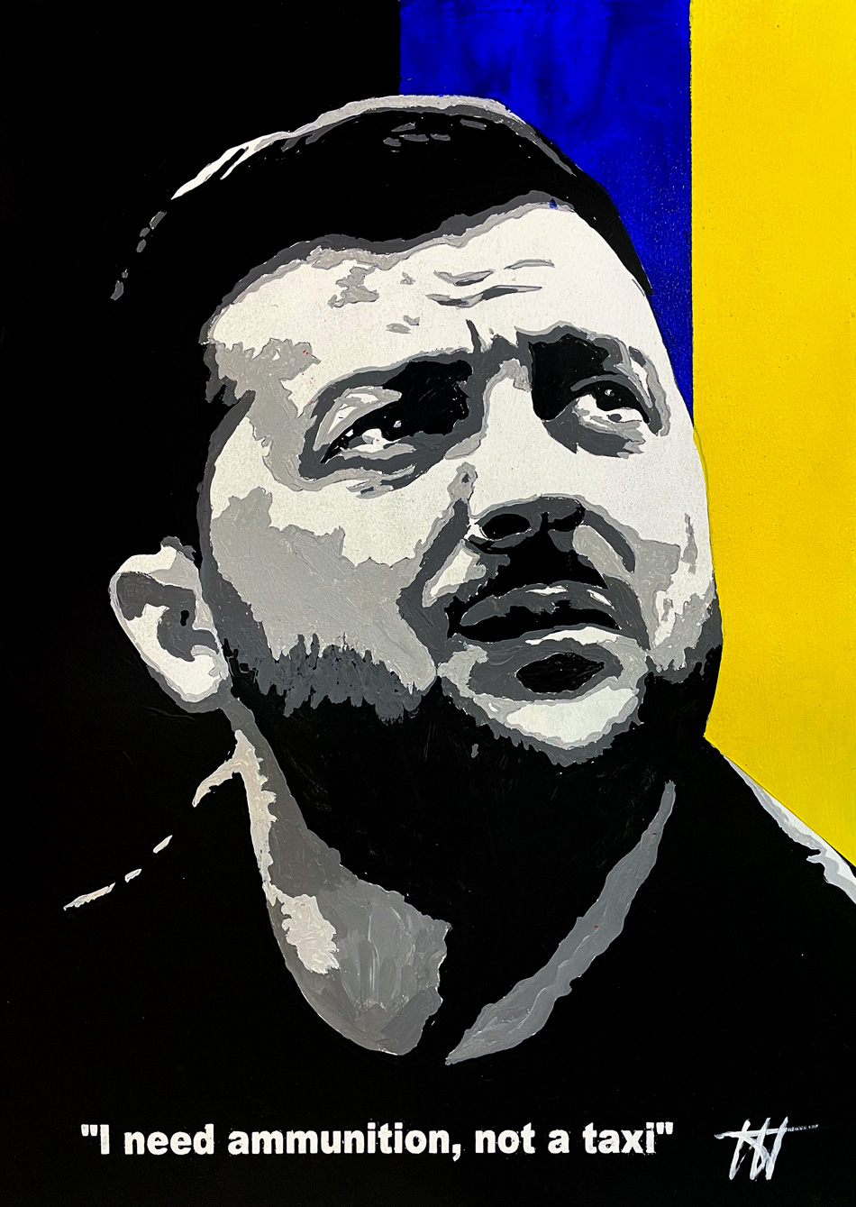 Ce qui rend ce tableau encore plus fascinant, c’est l’inscription audacieuse qui le surmonte : « I need ammunition, not a taxi » (J’ai besoin de munitions, pas d’un taxi). Cette déclaration percutante souligne l’urgence et la détermination du personnage, rappelant la résilience du peuple ukrainien dans des moments de conflit et de défense de leur patrie.